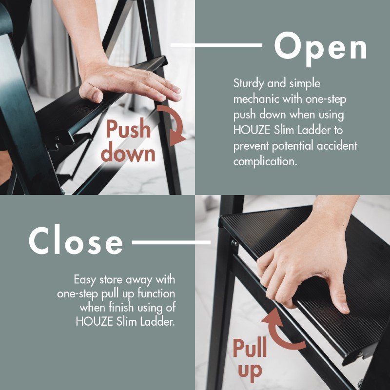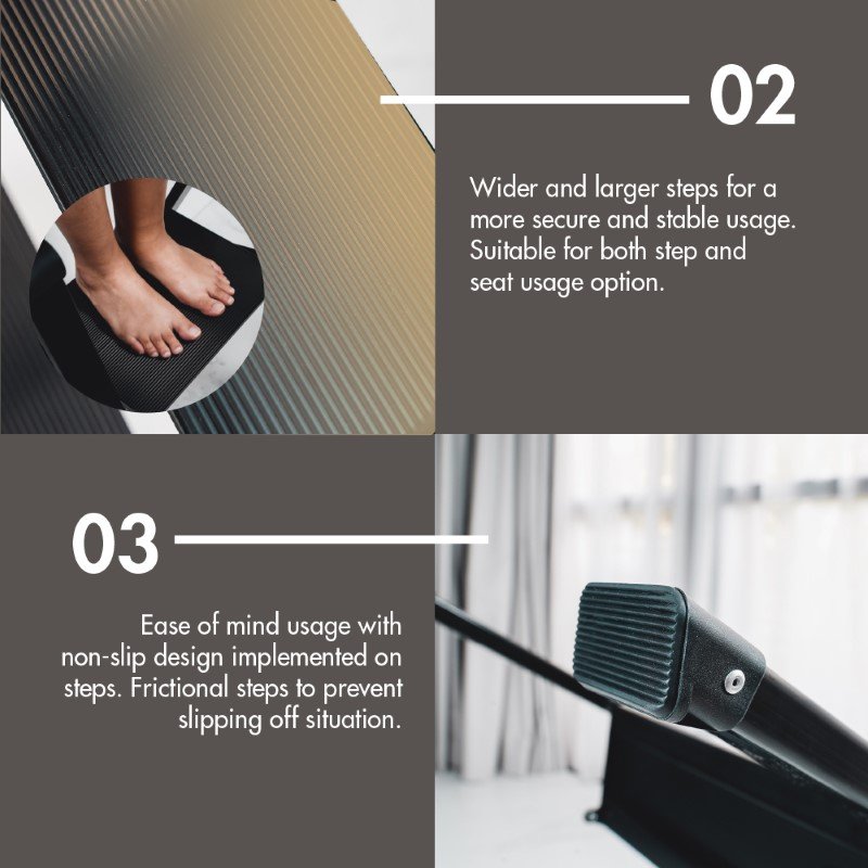 With its impressive 150 kg load capacity. top-notch safety features. and a tactile non-slip step surface. it truly is safety incarnate. Its light aluminium frame ensures effortless portability. and its slim profile is a testament to space innovation. With HOUZE. redefine your living standards. Opt for ‘SLIM’. and let every step elevate your Singaporean home experience.
