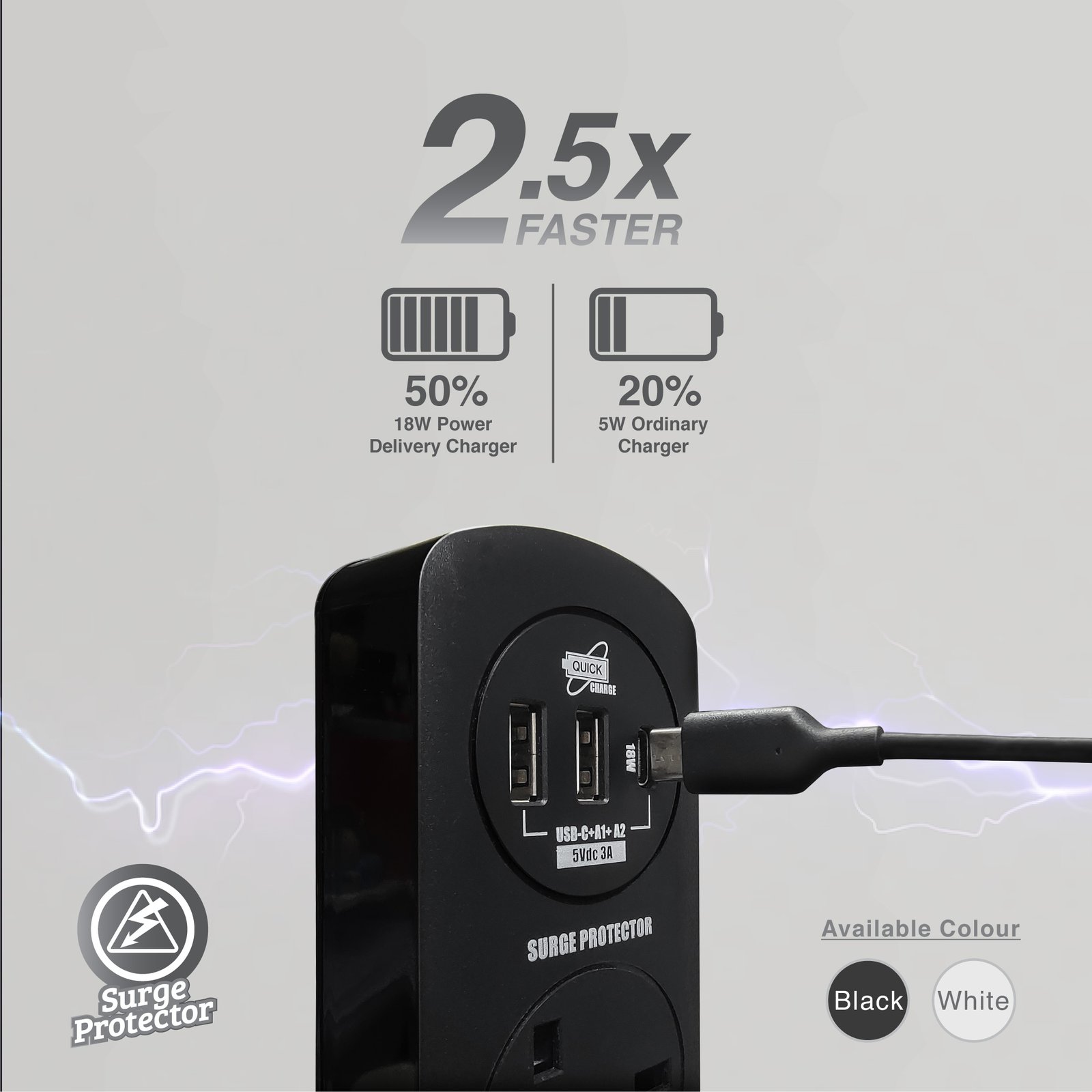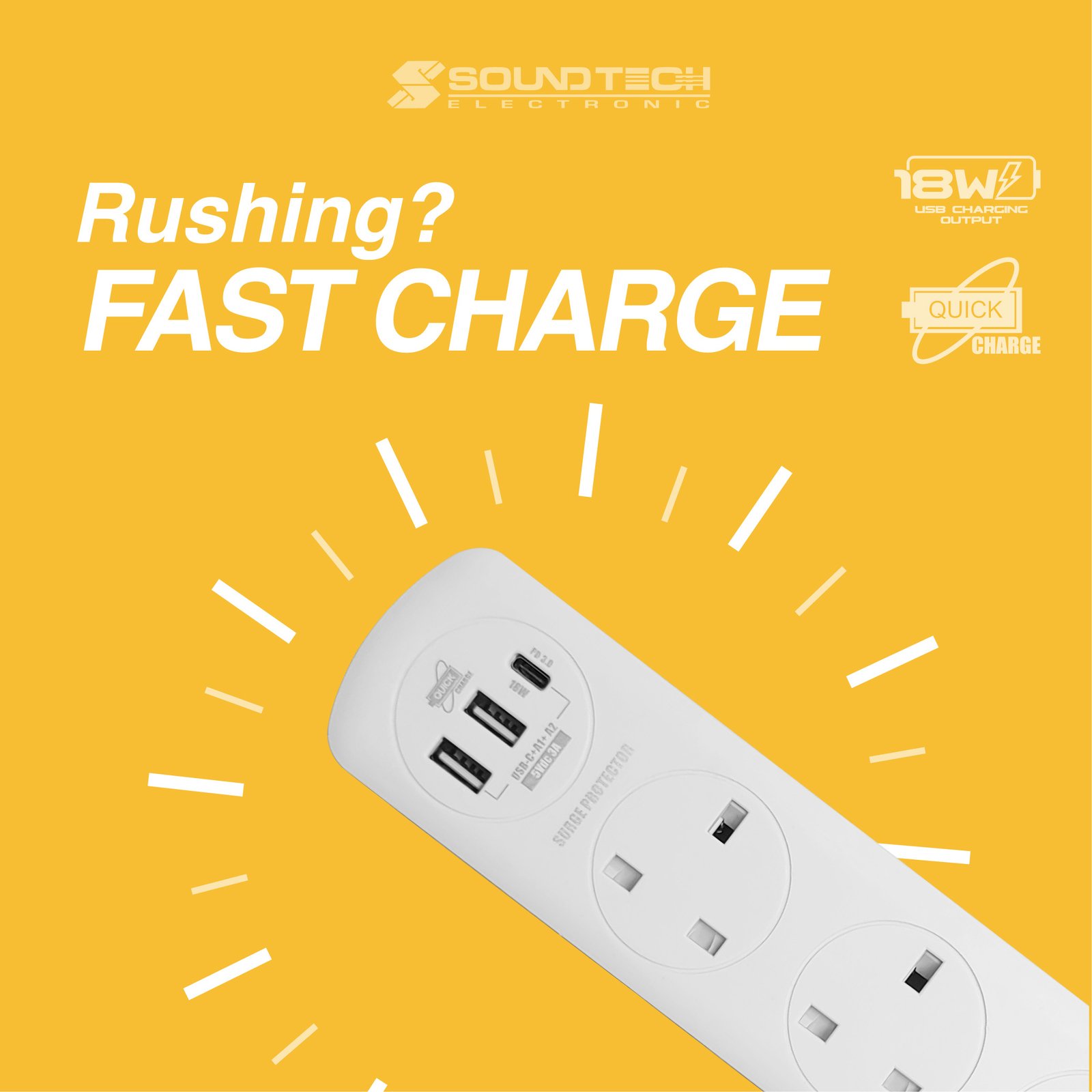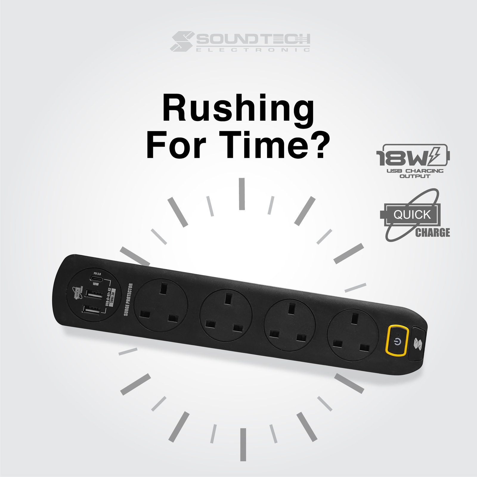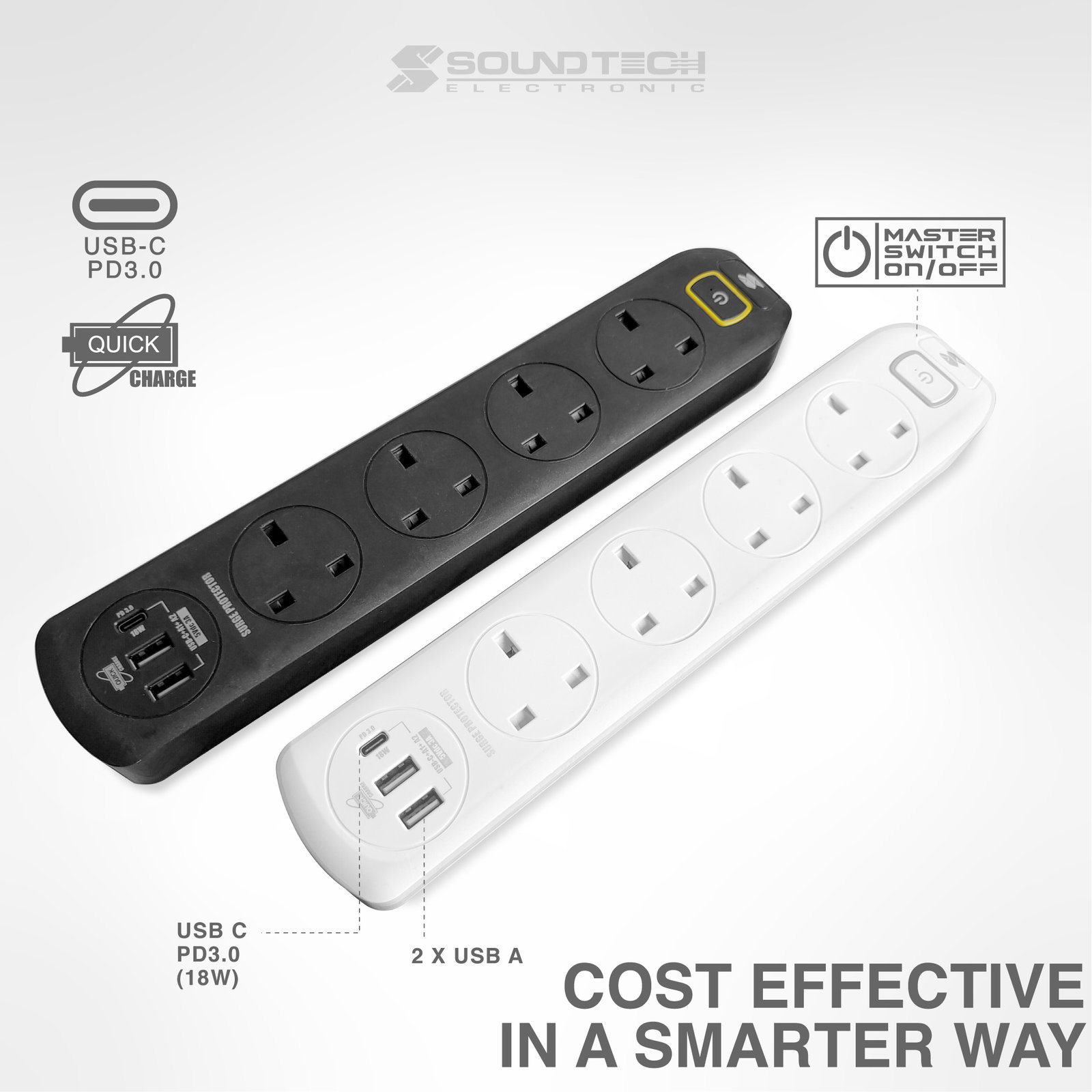 SOUNDTECH – 4Ways 2Metres Extension Socket with USB A+C. BLACK | WHITE