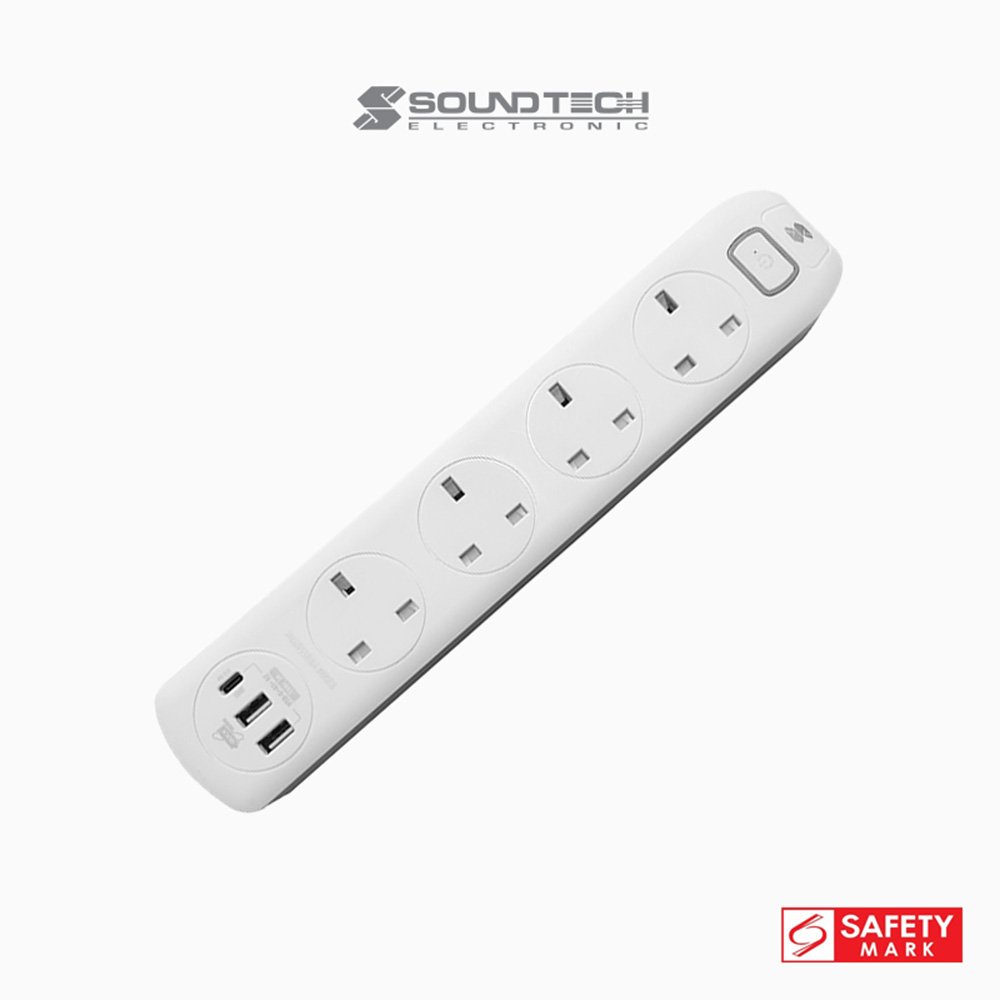 SOUNDTECH - 4Ways 2Metres Extension Socket with USB A+C. BLACK | WHITE
